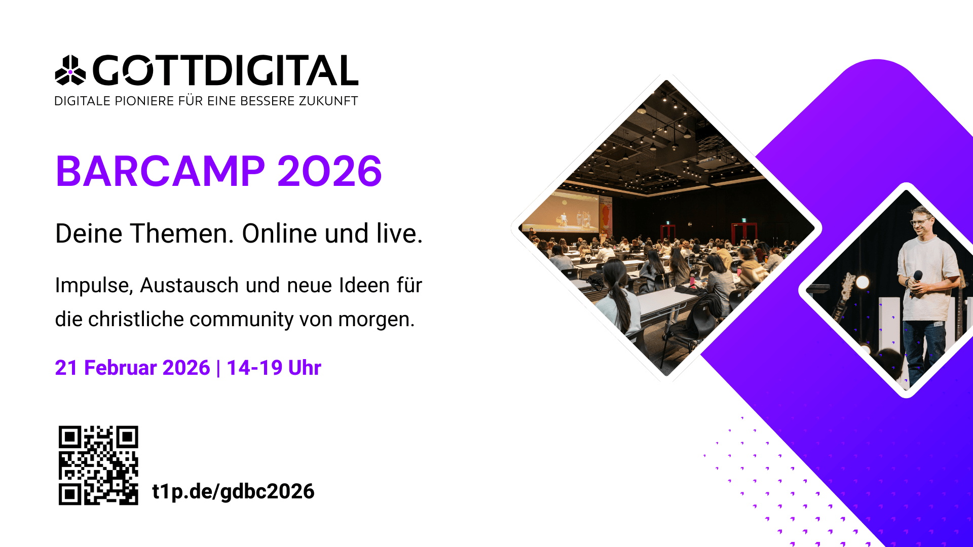 Auch 2026 veranstaltet GOTTDIGITAL mit dem Barcamp 2026 wieder ein großes Community-Event, das Raum dafür bietet, aktuelle digitale Themen in der christlichen Community zu diskutieren und neue Impulse zu geben.